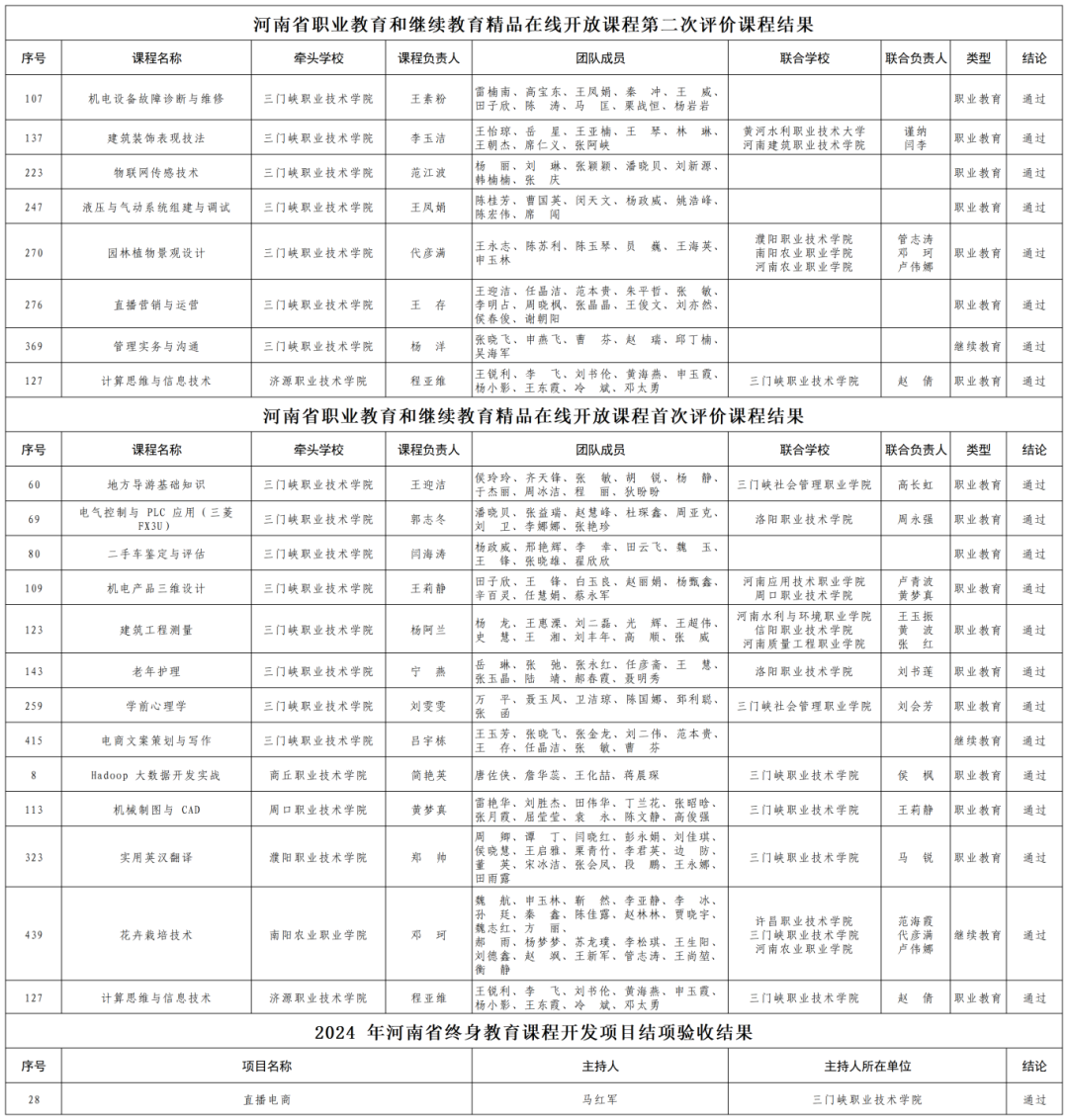近日,河南省教育厅办公室印发了《关于公布河南省职业教育和继续教育精品在线开放课程评价结果和终身教育课程开放项目结项验收结果的通知》(教办职成〔2025〕323号),学院2022年立项建设的《机电设备故障诊断与维修》等9门课程全部顺利通过第二次评价,被认定为河南省职业教育和继续教育精品在线开放课程和终身教育课程开放项目,同时,2023年立项建设的《地方导游基础知识》《电气控制与PLC应用(三菱FX3U)》等13门课程全部通过首次评价,通过率达100%,标志着我院在数字化课程体系建设与教学质量提升方面取得又一重要成果。