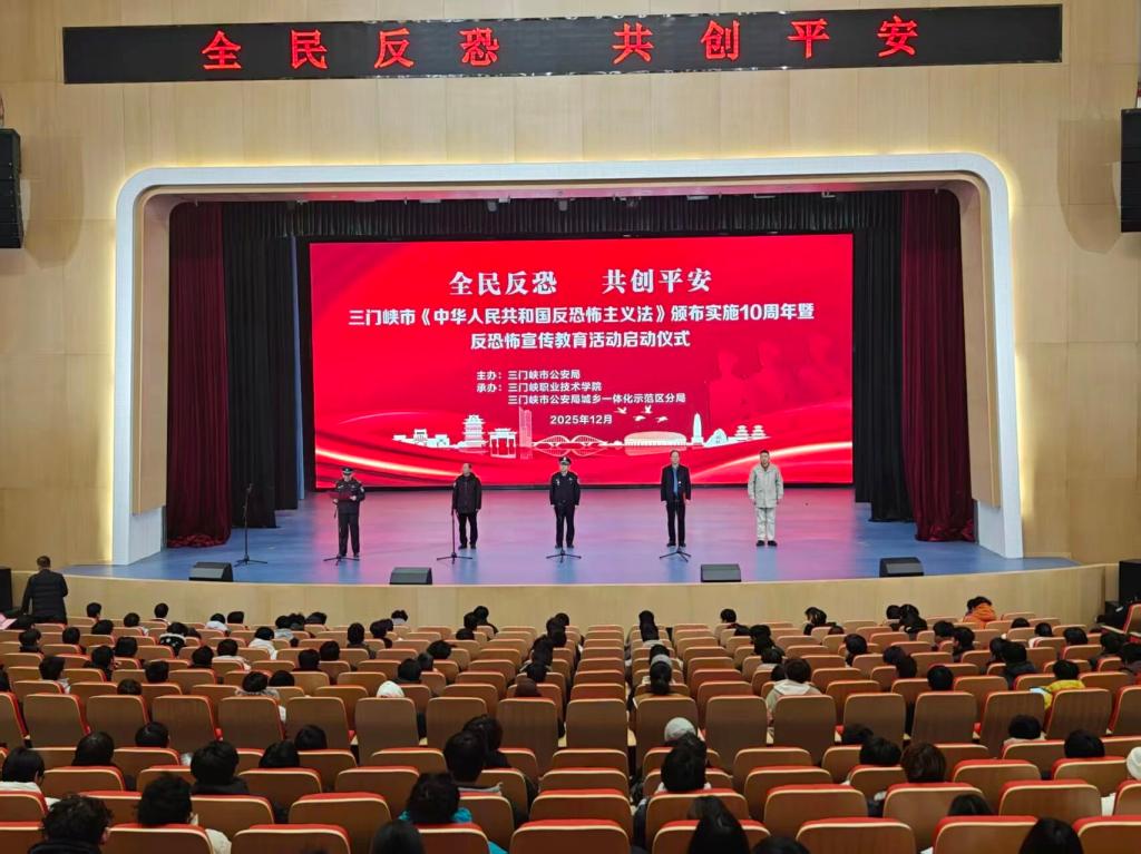 12月26日上午,在《中华人民共和国反恐怖主义法》颁布10周年之际,学院在学术报告厅举行反恐怖宣传教育活动启动仪式。三门峡市人民政府副市长、公安局局长王磊出席活动。三门峡市公安局党委委员、副局长焦露阳宣布反恐怖宣传教育活动正式启动。学院院长助理李启松、三门峡市城一体化示范区党工委副书记张涛及学院1000余名师生代表参加活动。城乡一体化示范区公安分局政委茹玉珂主持启动仪式。