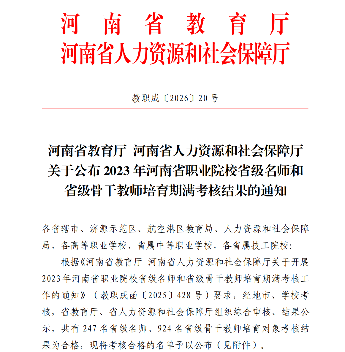 近日,河南省教育厅 河南省人力资源和社会保障厅发布了《2023年河南省职业院校省级名师和省级骨干教师培育期满考核结果的通知》(教职成〔2026〕20号),学院辛峰、郭立业等6名省级名师、段蕾、岳星等15名省级骨干教师全部通过考核,充分彰显了学院师资队伍建设的显著成效。