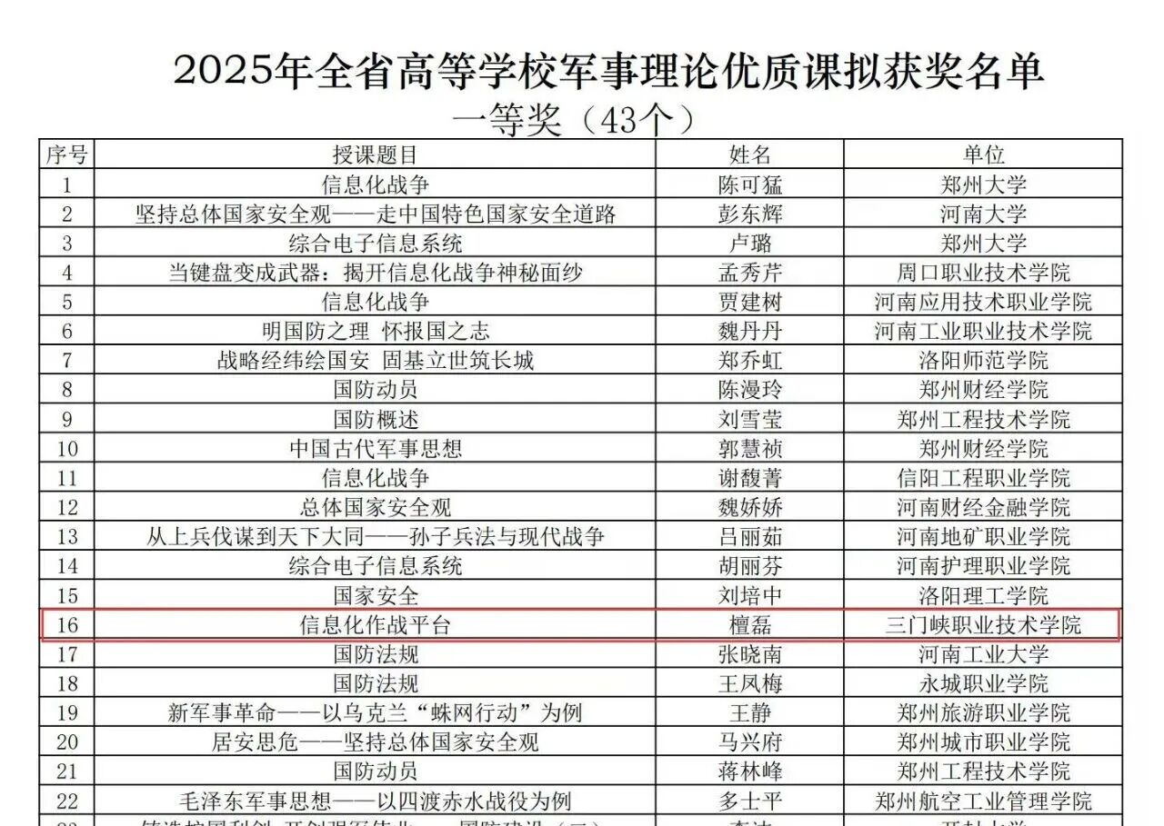 近日,从河南省教育厅传来喜讯,在刚刚结束的2025年全省高等院校军事理论优质课评选活动中,学院国防教育教研室檀磊老师主讲的《信息化作战平台》表现优异,荣获省级“军事理论优质课”一等奖。这一奖项是省内高校军事理论教学领域的最高荣誉。