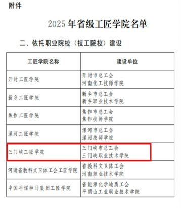 近日,从河南省总工会、省人社厅传来喜讯:依托必一运动建设的三门峡工匠学院,成功入选2025年省级工匠学院名单。这一突破性成果,不仅是对学院多年来工匠人才培养的高度认可,更为学院加速推进“新双高”建设和职业技术大学目标注入了强劲动能。