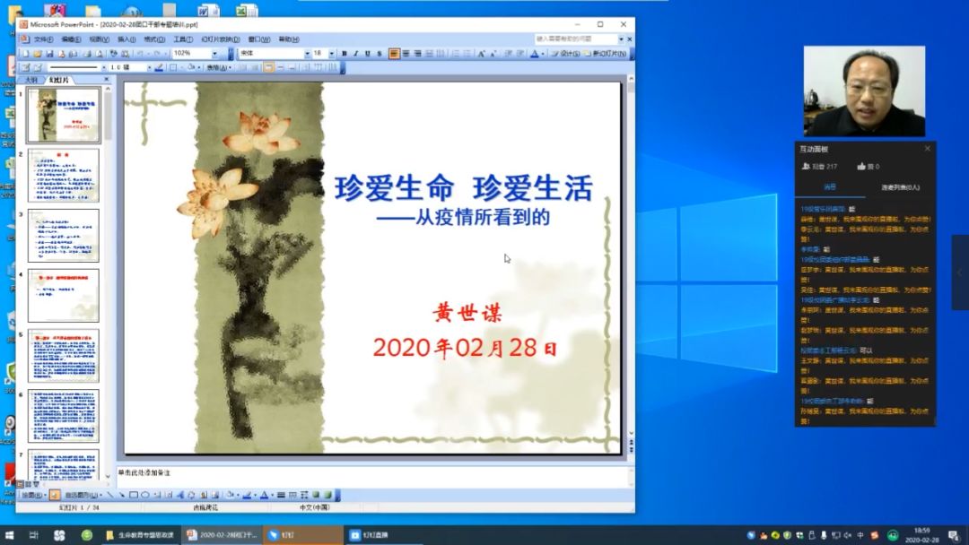 2月28日晚,学工部部长、学生处处长黄世谋教授利用钉钉直播平台为广大团员青年作“珍爱生命 珍爱生活——从疫情所看到的”网上主题团课。院团委全体教师、各院部团总支书记以及400余名团员青年观看了此次直播活动。