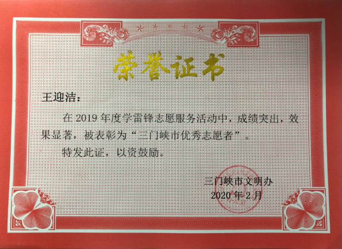 2019年三门峡市文明办在全市开展了学雷锋志愿服务“四个一批”先进典型推选活动,近日,市文明办发布《关于表彰2019年度三门峡市学雷锋志愿服务“四个一批”先进典型名单的决定》(三文明〔2020〕3号)。学院教师王迎洁荣获三门峡市“优秀志愿服务者”,学院“虢韵使者”三门峡地方文化推广志愿服务项目荣获三门峡市“优秀志愿服务项目”。