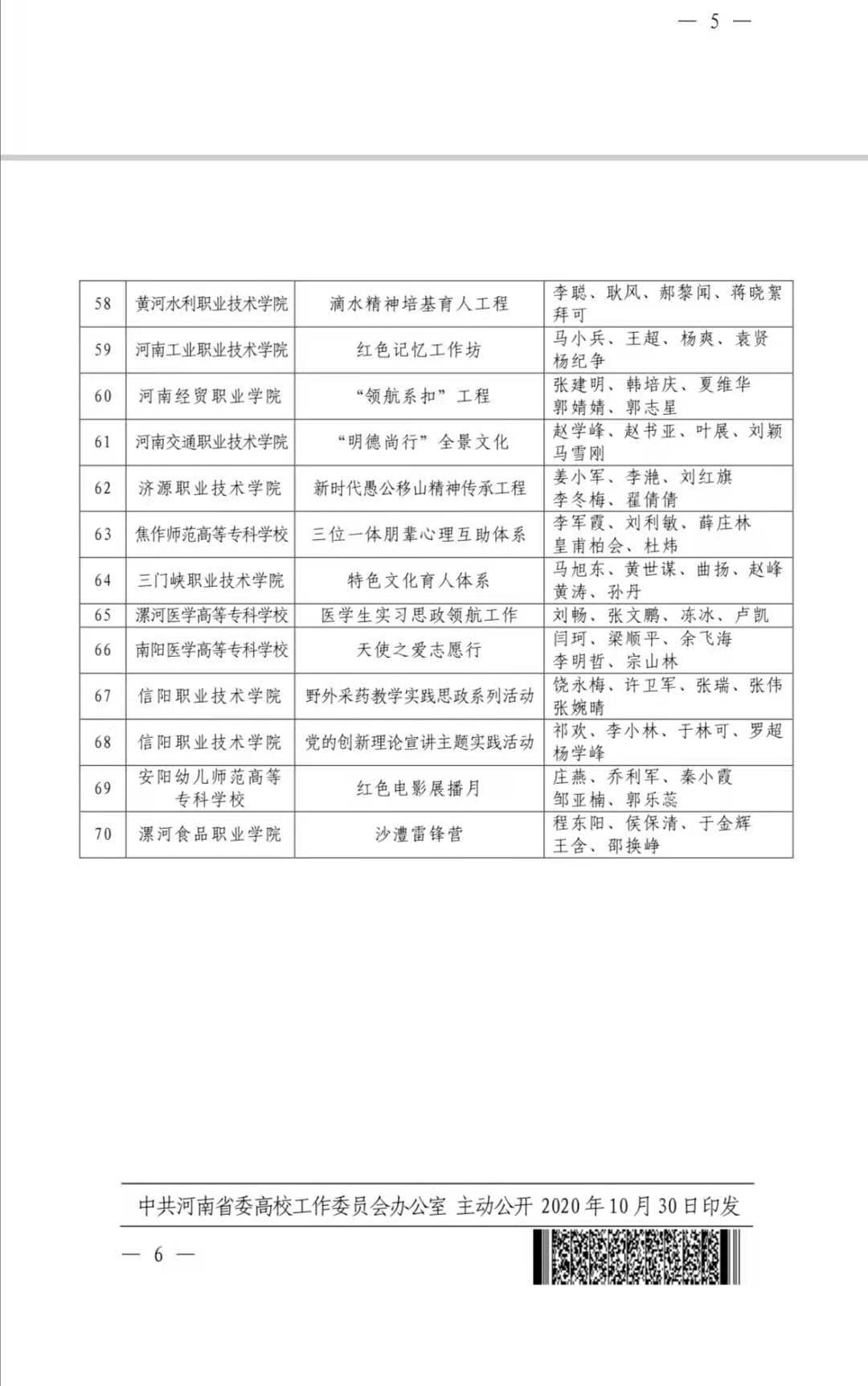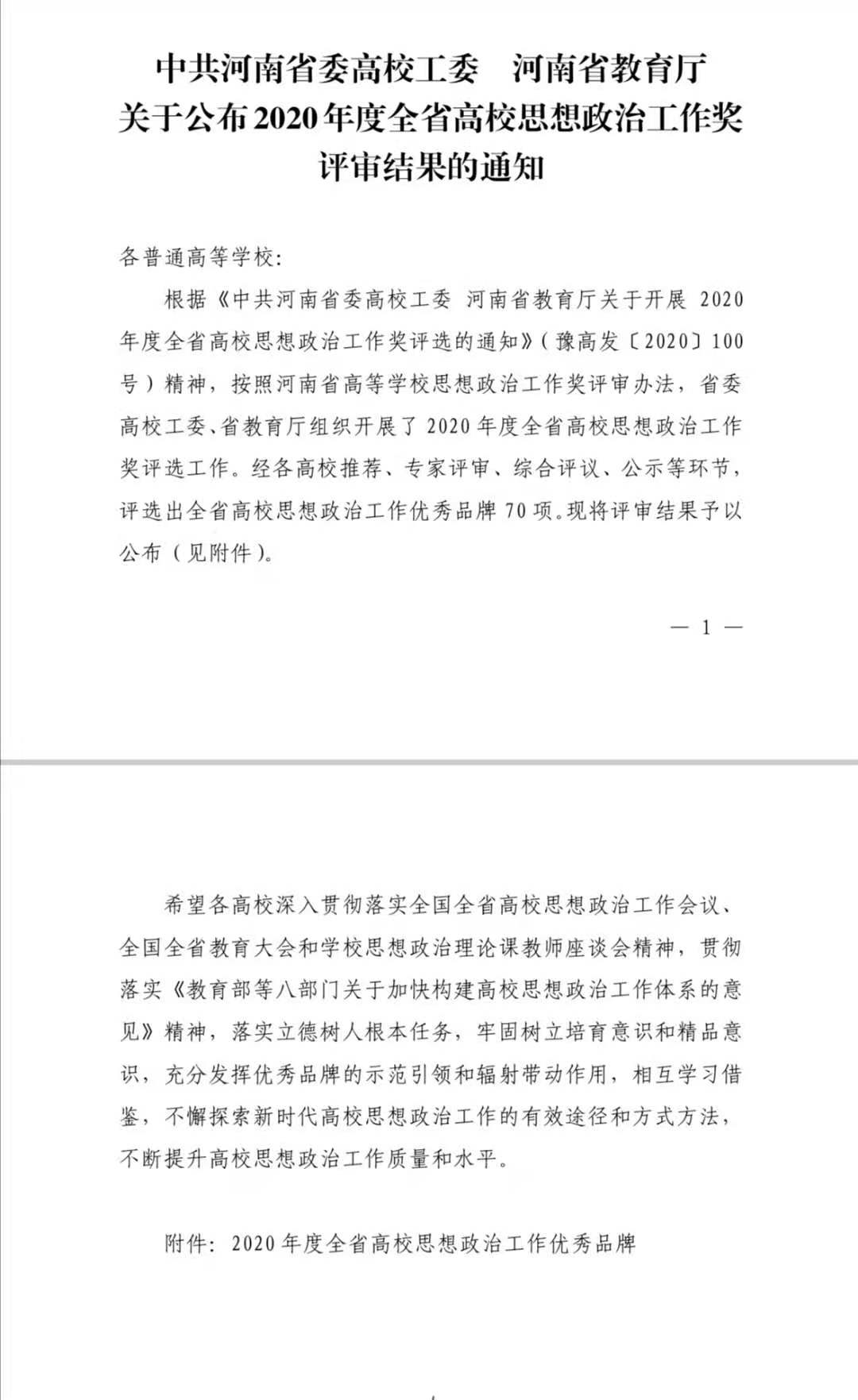 近日,由中共河南省委高校工委、河南省教育厅组织开展的2020年度全省高校思想政治工作奖暨思想政治工作优秀品牌评选结果揭晓,我院学工部报送的《特色文化育人体系》喜获2020年度“河南省高等学校思想政治工作优秀品牌”荣誉称号。