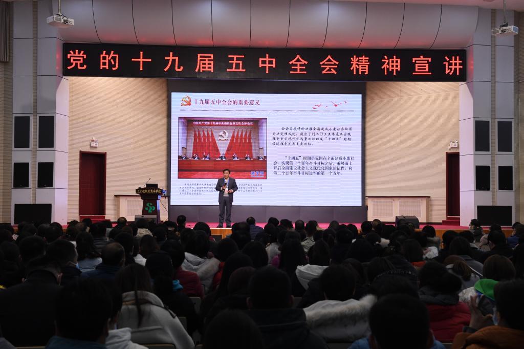 11月26日下午,我院在学术报告厅举行党的十九届五中全会精神宣讲报告会。党委副书记、院长吴勇军对十九届五中全会精神进行了全面解读,学院900余名教职工在现场聆听学习。宣讲报告会由学院党委副书记、工会主席宋六锁主持。
