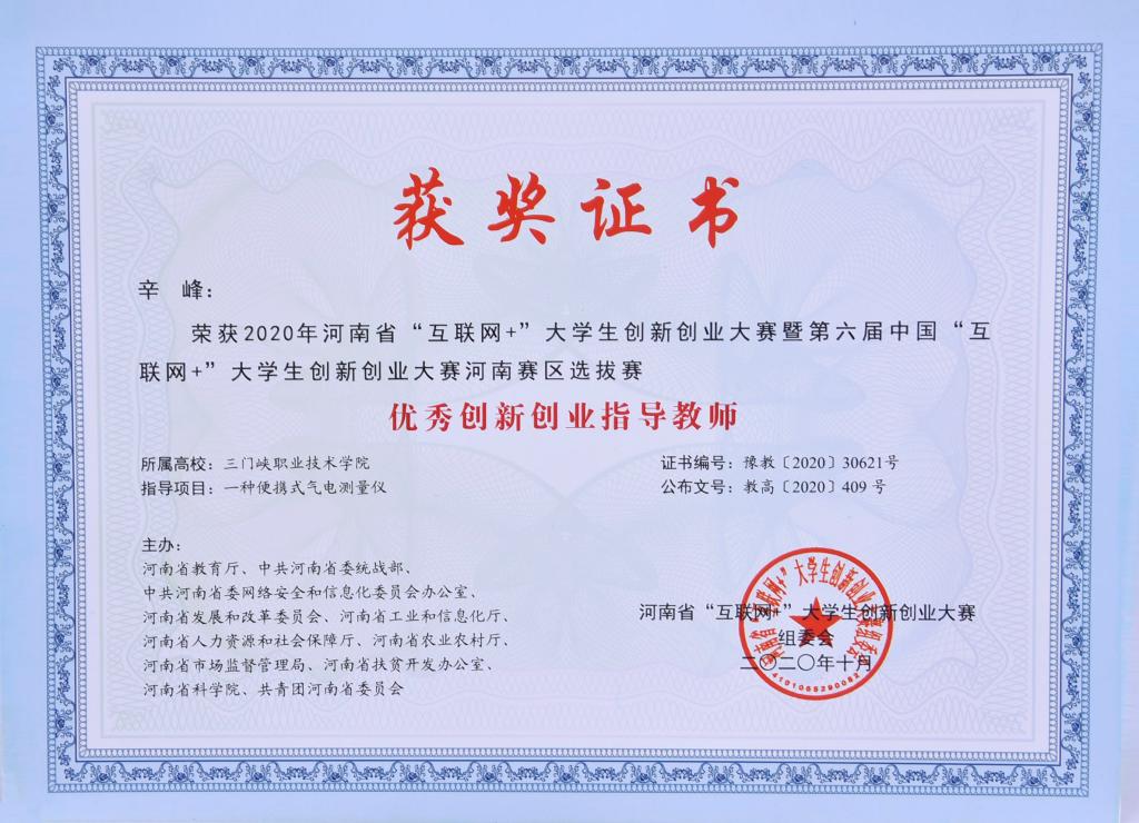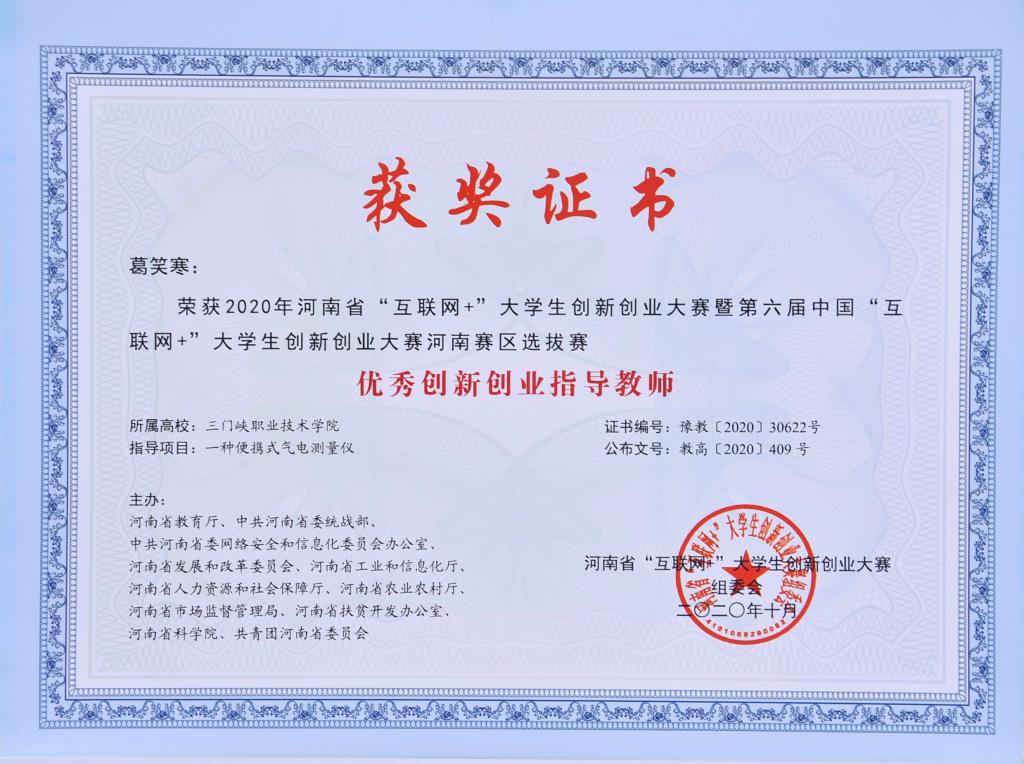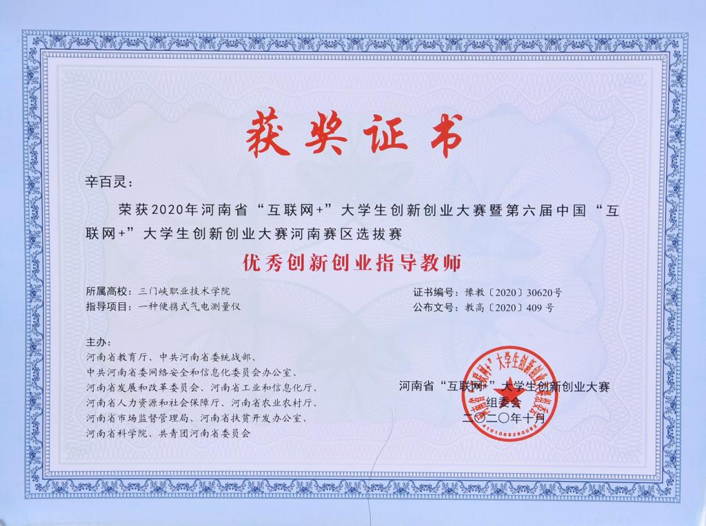 我院获2020年河南省“互联网+”大学生创新创业大赛暨第六届中国国际“互联网+”大学生创新创业大赛河南赛区选拔赛(主赛道、青年红色筑梦之旅赛道)优秀组织奖,为全省获此优秀组织奖的5所高职院校之一;在参赛项目方面,我院共获一等奖1项、二等奖9项、三等奖11项共21项奖励,其中由汽车学院、智能制造学院教师辛百灵、辛峰、葛笑寒指导,汽车学院、智能制造学院学生刘宇航、白凯志、付跃参赛的《一种便携式气电测量仪》荣获高教主赛道创意组一等奖;辛百灵、辛峰、葛笑寒荣获优秀指导老师奖。