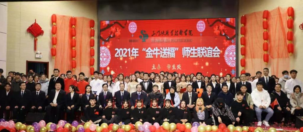 为加强我院青年学生的社会主义先进文化教育,构建良好地校园文化氛围,12月29日,由学生处主办、院学生会承办的2021年“金牛送福”师生联谊会在学术报告厅举行。党委委员、副院长马旭东,党委委员、组宣部部长侯玲玲,学工部部长、学生处处长黄世谋,学工部副部长、学生处副处长刘学文,学生处副处长曲扬,各院部学生科科长、学生处全体工作人员以及我院千余名学生代表观看了晚会。