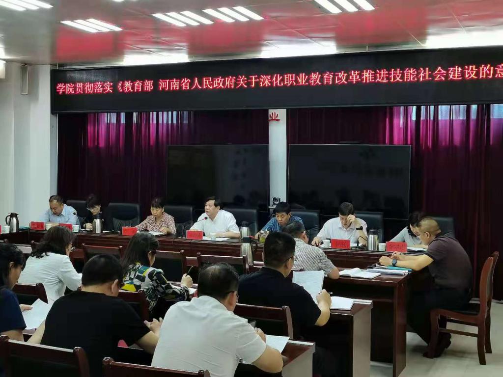 6月18日,院长颉潭成主持召开会议,传达学习《教育部 河南省人民政府关于深化职业教育改革推进技能社会建设的意见》,全体领导班子成员、相关职能处室负责人和各二级学院院长参加会议。