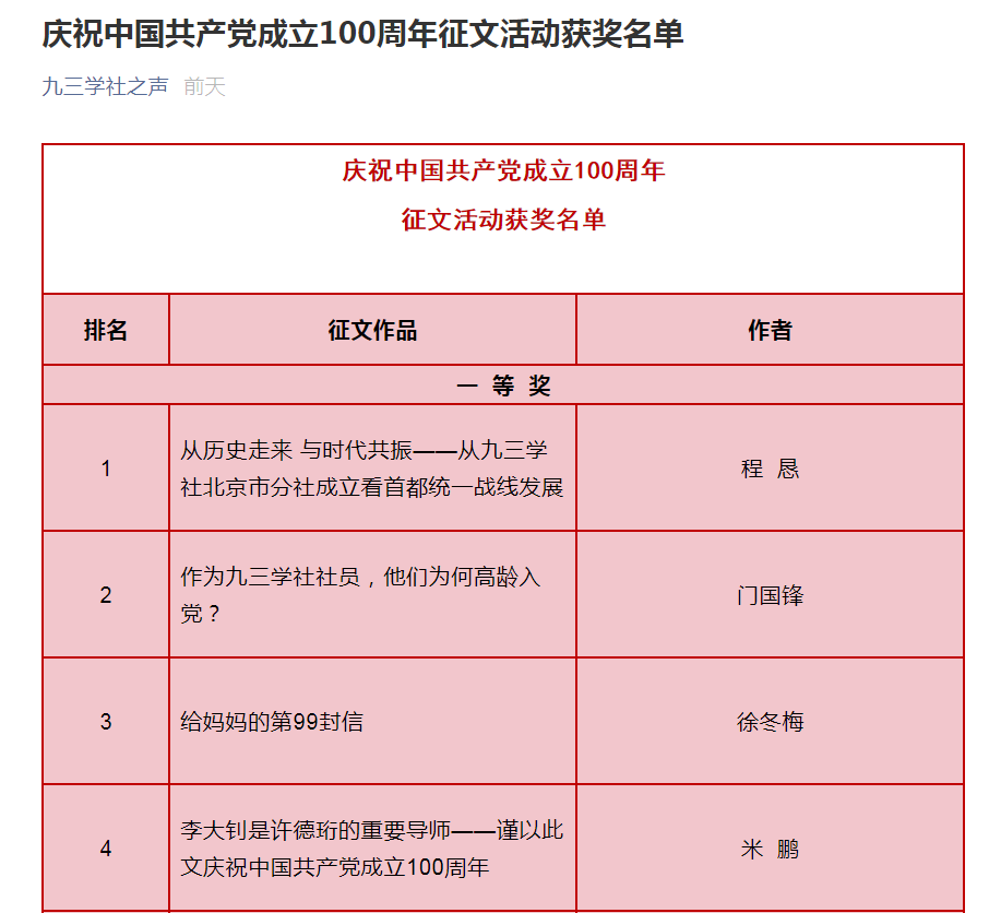 近日,九三学社中央公布了《关于表彰庆祝中国共产党成立100周年优秀征文的决定》,我院九三学社社员卞建宁老师撰写的理论研究文章被评为三等奖,是九三学社河南省委获得的3个奖项之一。