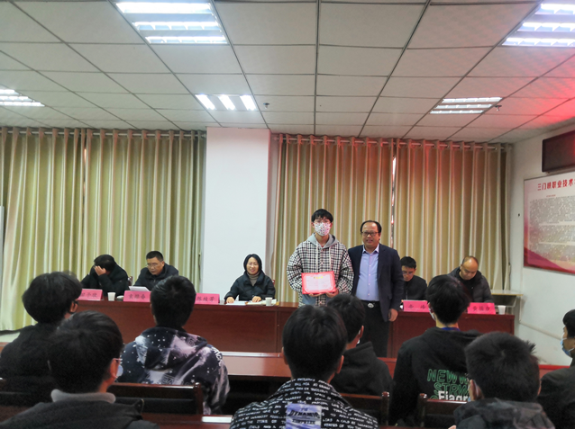 黄世谋在颁奖仪式上致辞,他首先对本次大赛的组织、宣传与筹办工作给予了充分肯定,对获奖单位和个人所取得的优异成绩表示祝贺。他指出,“工程制图”技能大赛的举办,是进一步深化教育教学改革,激发学生学习兴趣,推动学风建设,提高学生实践技能,全面落实学校倡导的“以赛促学、以赛促改”教育教学观念的重要举措,希望受表彰的选手认真总结提高,为把自己培养成素质全面的高技能人才而努力,发挥示范带动作用。