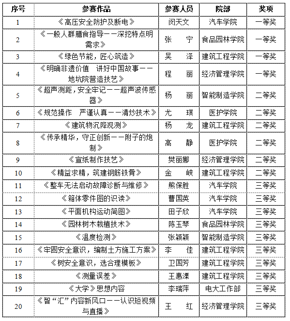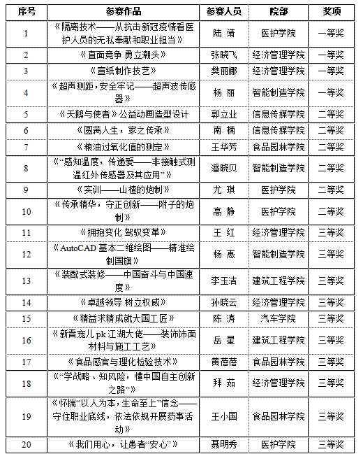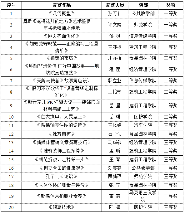 共有112名教师参加比赛,提交作品290件,其中教学设计赛项作品102件,微课视频赛项作品91件,典型案例赛项作品97件。经对各院部组织工作进行综合评定及校内专家网评,建筑工程学院、经济管理学院和医护学院获评优秀组织奖,三个赛项分别取前20名,共评比一等奖12人、二等奖18人、三等奖30人。