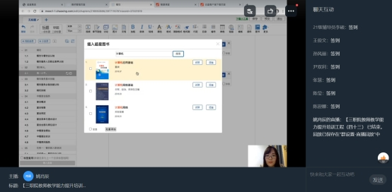 2月23日,魏雅倩以《在线课程建设之资源应用》为题,对全院教师进行了在线课程建设的资源建设和应用方法的培训。她从示范教学包使用、资源引用和自建资源三个方面介绍了基于超星泛雅平台的在线开放课程建设方法,结合实例演示了超星泛雅平台资源引用方法,为我院精品在线开放课程建设提供了指导性建议。