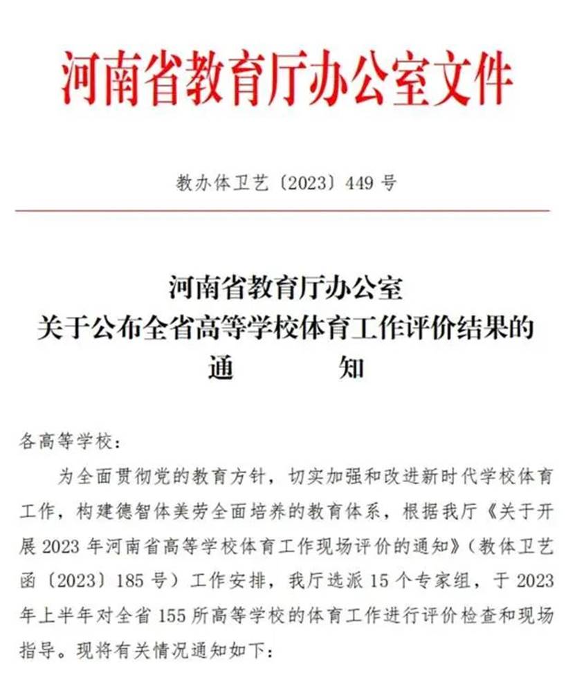 近日,河南省教育厅印发《河南省教育厅关于公布全省高等学校体育工作评价结果的通知》,经教育厅专家组进校现场评价,我校被评为河南省高职高专学校体育工作“一类院校”。