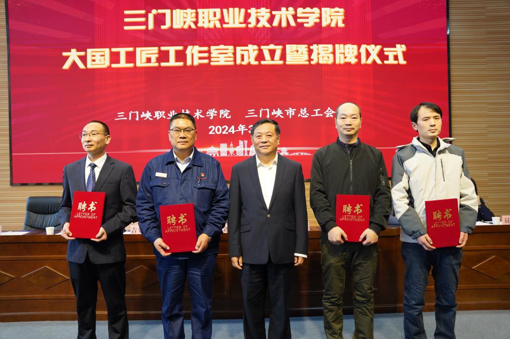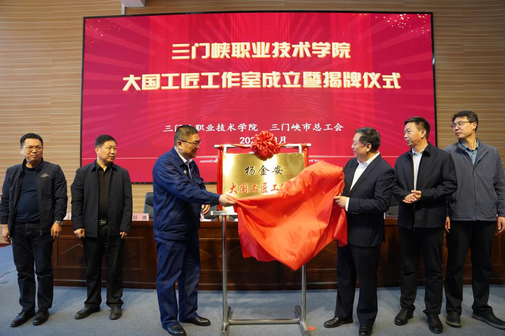 颉潭成向首批聘任的学院大国工匠杨金安、李建政、孙云飞、谢照增颁发“特聘导师”聘书,并与杨金安共同为“杨金安大国工匠工作室”揭牌。