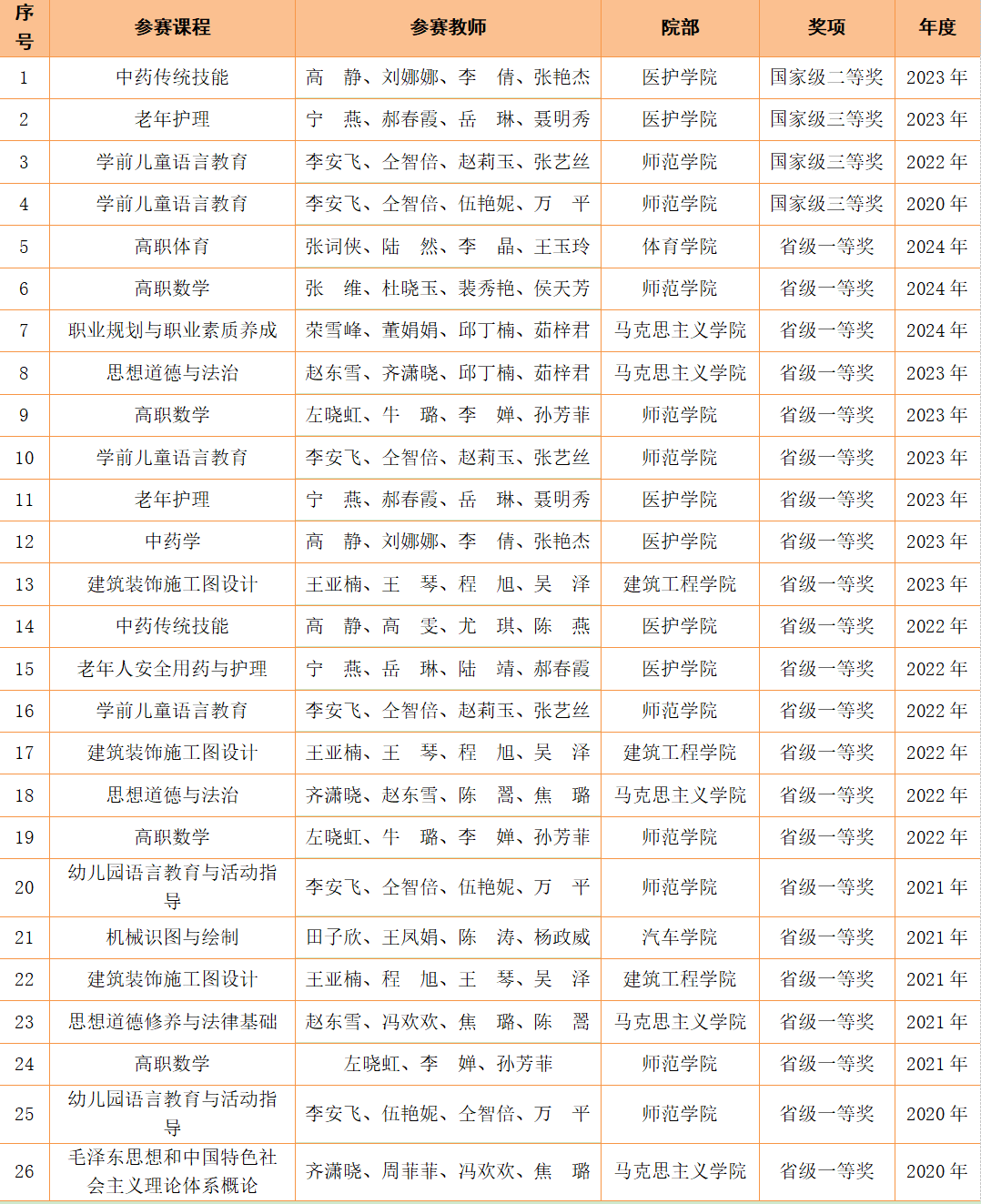 学院2020年—2024年高等职业教育教学能力比赛省级一等奖及以上获奖情况一览表