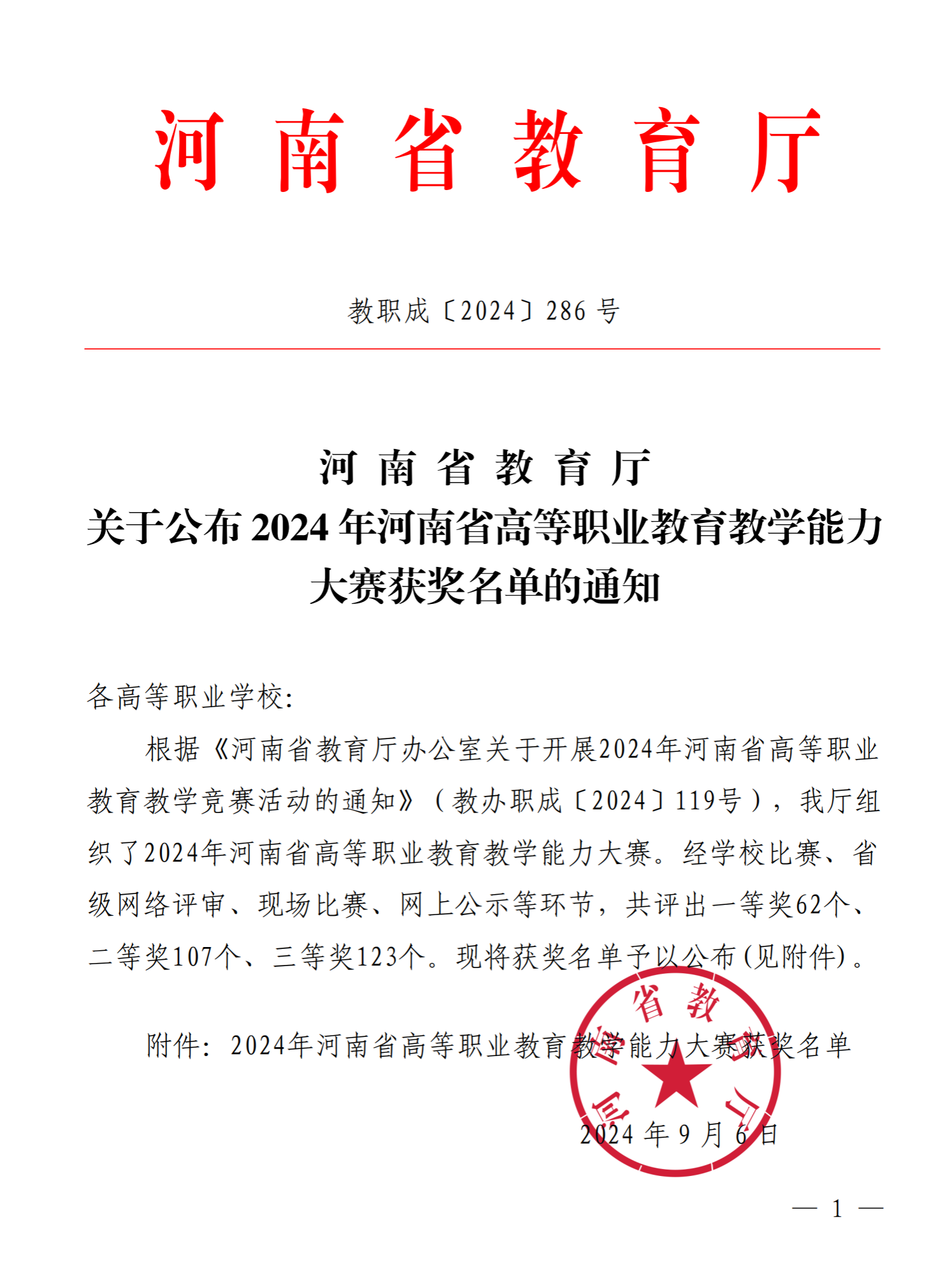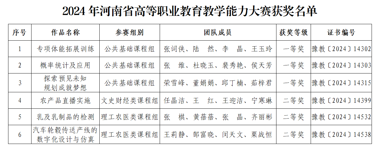 近日,河南省教育厅发布了《关于公布2024年河南省高等职业教育教学能力大赛获奖名单的通知》。我院6支参赛团队经过激烈角逐,全部获奖,其中一等奖3项、二等奖3项,综合排名位居全省第三名,4个作品位居各专业类全省第一名。