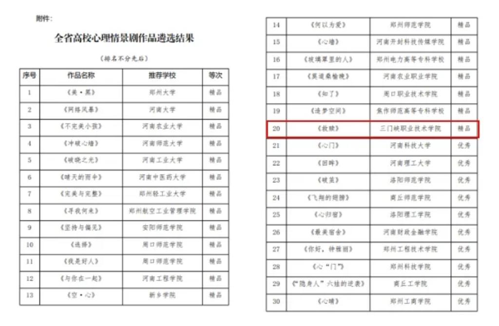 近日,省教育厅公布了全省高校心理情景剧作品遴选结果,学院报送的心理剧《救赎》在全省高校心理情景剧作品征集展演活动中喜获精品。