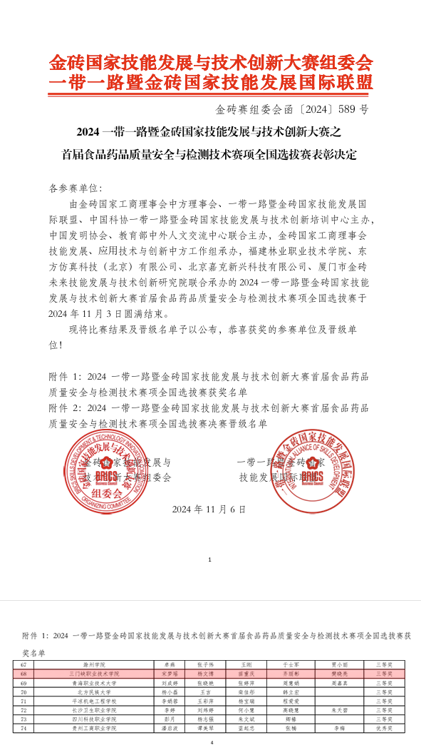 2024年11月3日,2024一带一路暨金砖国家技能发展与技术创新大赛首届食品药品质量安全与检测技术赛项全国选拔赛圆满落幕。我院食品园林学院学子宋梦瑶、杨文博、苗重庆组成的团队获全国选拔赛三等奖。