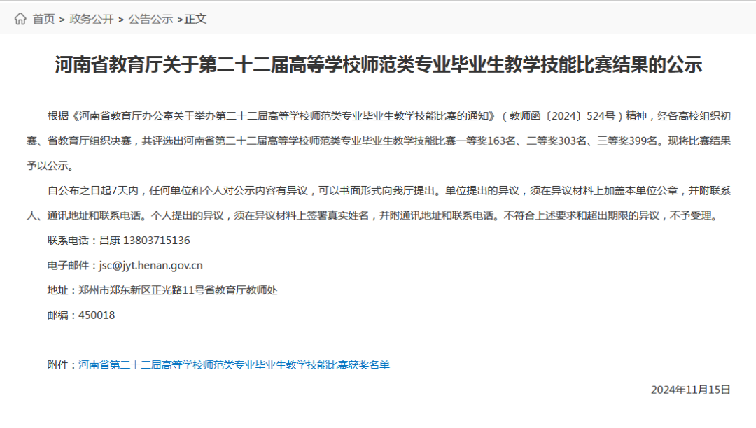 近日,河南省教育厅发布《关于第二十二届高等学校师范类专业毕业生教学技能比赛的公示名单》,我院师范学院李贝贝、安浩、吕威伟、肖一佳四位参赛学生表现出色,获得省级一等奖1项、二等奖1项、三等奖2项,为学院赢得荣誉。