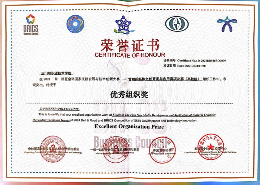 本次大赛由金砖国家工商理事会(BRICS BC)、一带一路暨金砖国家技能发展国际联盟(IASDB)、教育部中外人文交流中心等单位联合主办,是推动金砖国家间教育合作、技能开发和人文交流活动的重要平台。首届新媒体文创开发与应用赛项,围绕新媒体作品创意设计与制作开展,包括职业能力测试、实操比赛、实操答辩三个方面的一系列比赛,重点考核选手新媒体文创开发与应用能力,旨在发掘和培养一批具有创新精神和专业技能的新媒体文创人才,为产业的发展提供有力的人才支撑。