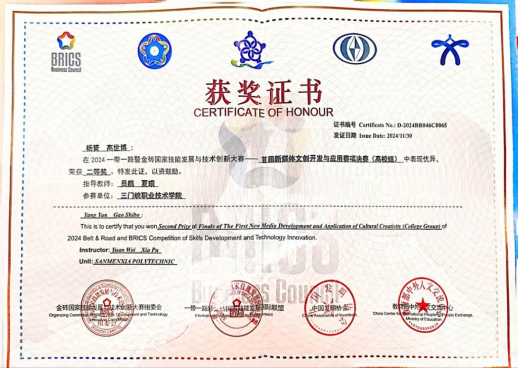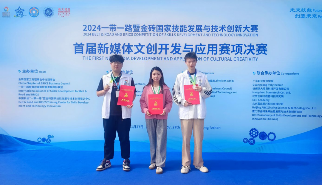 11月30日,2024一带一路暨金砖国家技能发展与技术创新大赛--首届新媒体文创开发与应用赛项全国总决赛在广东举行。经过层层选拔,共有99支队伍、近200名选手进入最终对决。信息传媒学院2022级虚拟现实技术专业学生杨贇、高世博最终以总成绩第五名的优异成绩,荣获全国总决赛(高校组)二等奖(银奖),学院荣获“优秀组织奖”,员巍、夏璞两位指导教师荣获“优秀指导教师”。