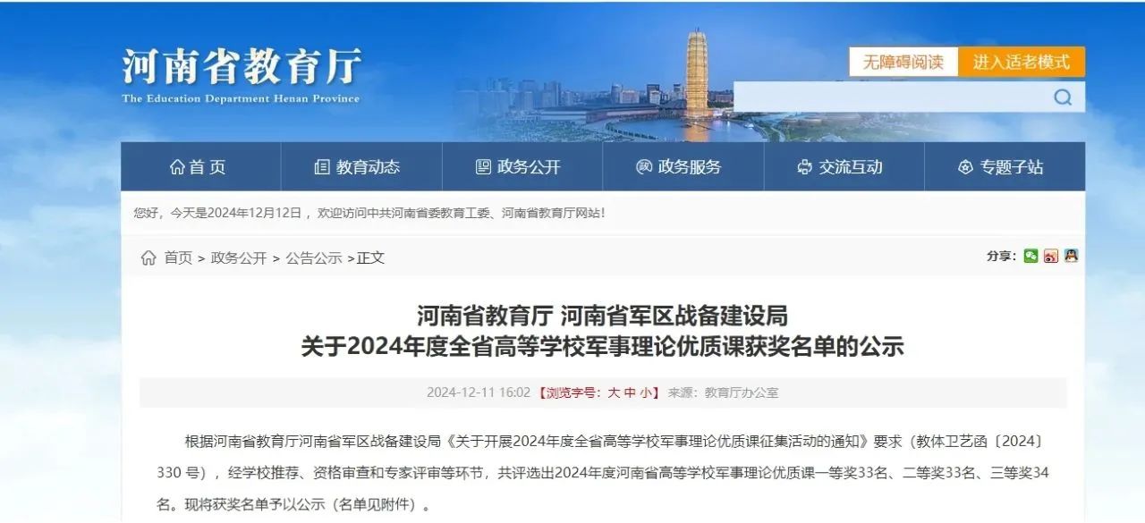 近日,由河南省教育厅、河南省军区战备建设局主办的“2024年度全省高等学校军事理论优质课征集活动”公布结果,马克思主义学院国防教育教研室军事理论课兼职教师施利利荣获“一等奖”。