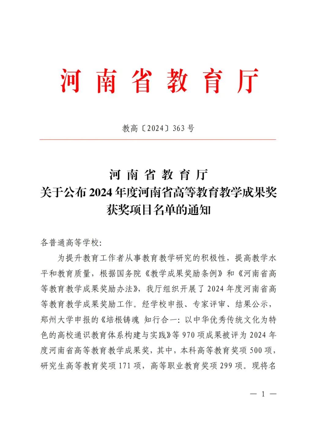 近日,河南省教育厅发布了《关于公布2024年度河南省高等教育教学成果奖获奖项目名单的通知》(教高〔2024〕363号),我院7个项目全部通过2024年河南省高等教育教学成果奖认定,荣获一等奖3项、二等奖4项,获奖数量创历史新高。