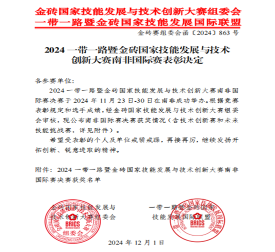 此次大赛,不仅展示了学院在人才培养、教学改革、专业建设等方面取得的优异成绩,更推动了学院与南非国家院校的文化交流与技术合作。学院将以本次大赛为契机,持续构建“以赛促教、以赛促学”的课赛融合培养模式,深化教学改革,拓展国际交流合作,提高国际化办学水平,持续培养具有国际视野的高素质工匠型人才。