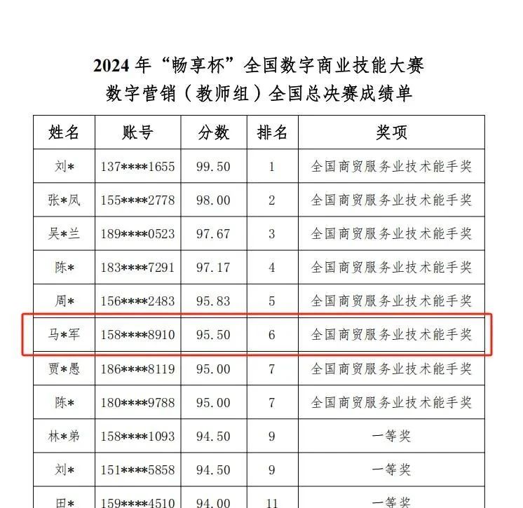 本次数字营销赛项,从赛事报名到选拔赛,再到总决赛,时间紧、任务重,是对选手综合能力和毅力的极大考验。这份荣誉的取得,既充分证明了马红军老师扎实的教学基本功和过硬的职业技能,也展示了学院积极践行“以赛促学、以赛促教、以赛促改、以赛促建”的教学改革成果。