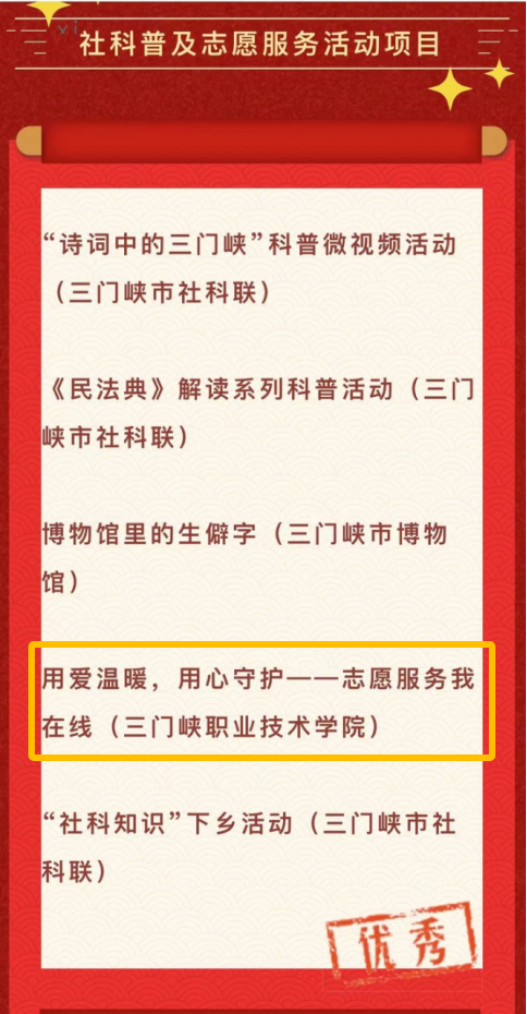 近日,河南省社科联印发了《关于表扬2024年社科普及活动中表现突出单位、个人和特色活动的通报》(豫社科联字〔2024〕17号),由我院报送的“用爱温暖 用心守护——志愿服务我在线”志愿服务项目,凭借出色的志愿服务成效与社会科普价值,成功获评河南省社科联社会科普志愿服务活动优秀项目。