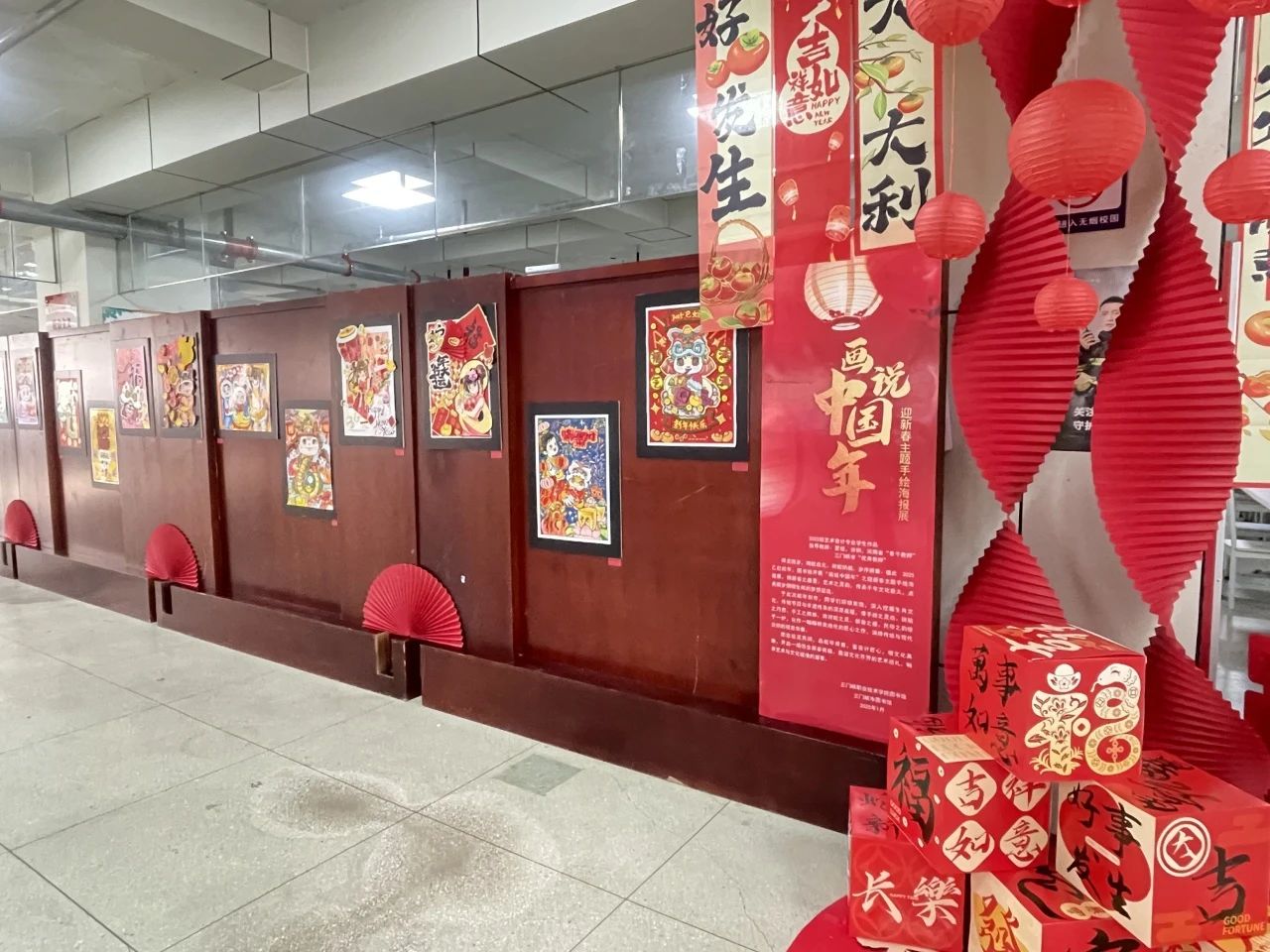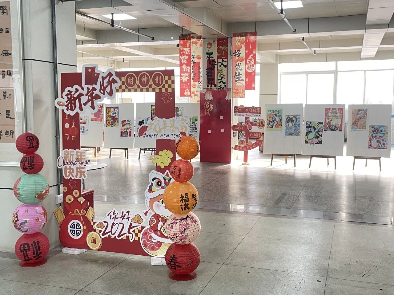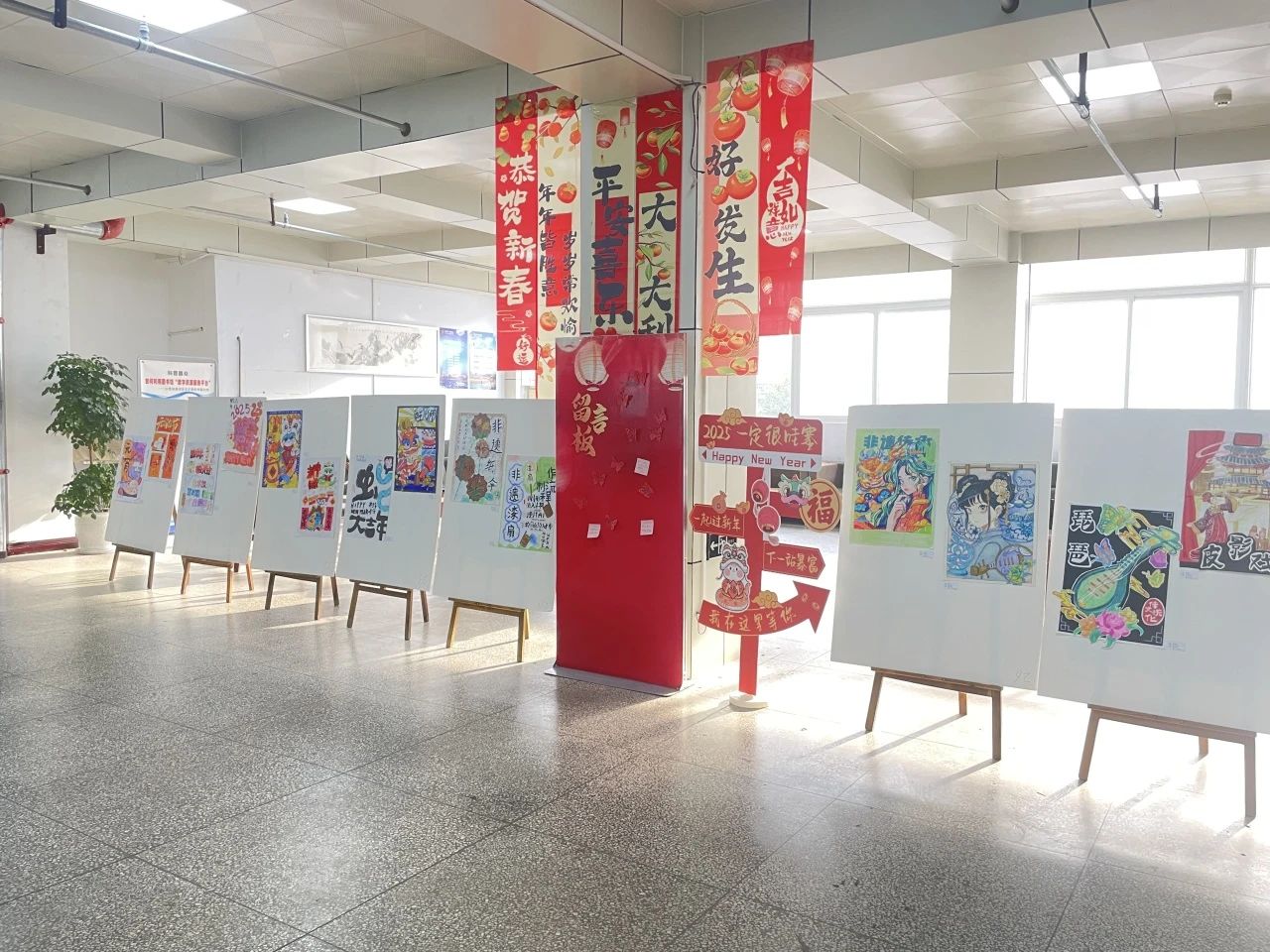 为全面实施“时代新人铸魂工程”和“大思政课”建设工程,进一步完善思政工作体系,构建大思政格局,近日,一场别开生面的美育教学成果展在图书馆1楼拉开帷幕。此次展览以“画说中国年” 为主题,旨在深入挖掘和传承中华优秀传统文化,将大思政教育理念融入其中,引导学生们增强文化自信,弘扬社会主义核心价值观,让师生在欣赏艺术作品的同时,深刻领悟党的政策精神,传承千年文化薪火,点亮新岁熠熠生辉的梦想征途。在创作过程中,学生们充分发挥自己的想象力和创造力,将传统与现代相结合,创作出了一幅幅富有创意和感染力的手绘海报。这些海报不仅色彩鲜艳、构图精美,更蕴含着学生们对春节这一传统节日的热爱和祝福。