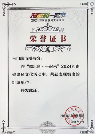 近日,河南省文化和旅游厅公布了《关于表彰“豫出彩·一起来”2024年河南省惠民文化活动表现突出的作品节目、团体和个人、组织单位的通报》,学院图书馆获得“表现突出的组织单位”称号,2个阅读项目获得表现突出的阅读品牌;3个作品获得“童心向祖国”全省少儿诵读活动表现突出的作品;“三门峡DIY亲子手工坊团队”获得“2024全民阅读活动”优秀志愿团队。