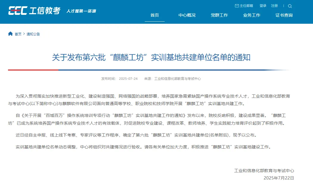 “麒麟工坊”实训基地共建项目由工业和信息化部教育与考试中心联合麒麟软件有限公司共同发起,面向普通高校、职业院校和技师学院,旨在深入落实国家关于加快推进新型工业化、建设制造强国和网络强国的战略部署,着力培养国家急需的国产操作系统专业技术人才。目前,“麒麟工坊”已成为系统化培养国产操作系统领域技术人才的重要平台,对促进合作院校的专业建设、课程改革、师资培养以及提升学生实践能力和评价体系都发挥了积极作用。