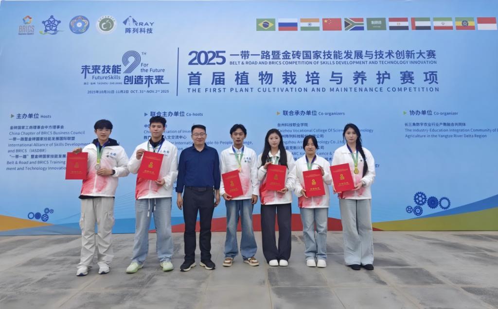 2025年11月2日,2025一带一路暨金砖国家技能发展与技术创新大赛首届植物栽培与养护赛项国内决赛在浙江台州科技职业学院成功举办。学院选派的三支师生代表队凭借扎实的专业知识、娴熟的操作技能和稳定的现场发挥,从来自全国的169支参赛队伍中脱颖而出,斩获1金、1银、1铜的优异成绩,实现该赛事成绩的历史性突破,彰显了我院在园林技术领域人才培养的雄厚实力,更展现了“以赛促教、以赛促学、以赛促改”教学改革理念的丰硕成果。