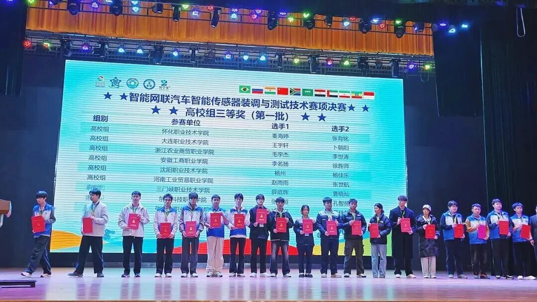 近日,2025一带一路暨金砖国家技能发展与技术创新大赛之“智能网联汽车智能传感器装调与测试技术”赛项决赛在湖南湘西民族职业技术学院成功举办,我院汽车学院尹金楷、金银平两位老师指导的24级智能网联汽车技术专业学生薛庭辉、曹晓灿,凭借扎实的专业功底、娴熟的实操技能与沉稳的现场表现,从全国众多参赛队伍中脱颖而出,荣获全国高职组铜奖。这一荣誉不仅为我院新能源汽车技术专业群中智能网联汽车技术专业再添闪亮勋章,更彰显了学院在智能网联汽车领域人才培养的扎实成效,为高水平专业群建设注入了强劲动力。