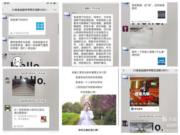 从微信公众号、微信群、QQ群、抖音等线上新媒体平台入手,形成宣传矩阵,全面开展防疫宣传,每天推送防疫知识小视频、疫情防控小提示,按时推送疫情防控相关新闻等,普及防疫健康知识,以网络正面宣传引导良好的舆论氛围。确保全方位、不间断让防疫知识入脑入心,将防疫宣传融入到学生学习生活的方方面面,做到防疫宣传常态化、多样化,充分利用网络的传播力筑起学院防疫墙。
