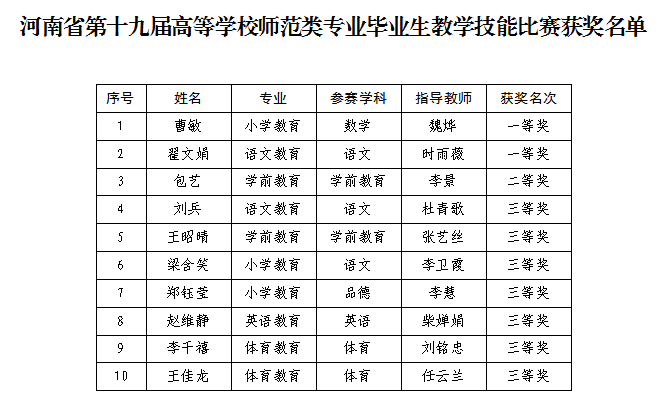 近日,河南省教育厅发布了《关于公布第十九届高等学校师范类专业毕业生教学技能比赛结果的通知》(教师〔2022〕167 号),我院10名参赛学生全部获奖,其中一等奖2名、二等奖1名、三等奖7名。