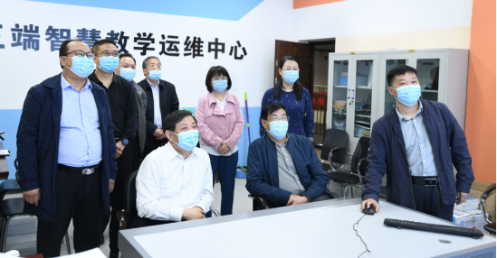 4月28日上午,党委副书记、院长颉潭成,党委副书记宋六锁,党委委员、副院长黄世谋,副院长万平,党委委员、组宣部部长侯玲玲到天鹅湖校区办公楼二楼一平三端智慧教学运维中心检查指导静态管理期间线上教学工作。党政办公室、教务处、学生处负责人及教务处工作人员陪同参加。