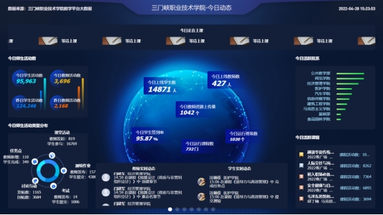受疫情影响,学院于4月28日起开始实施线上教学,除个别实践课外,其他课程全部采用线上教学方式进行授课。从一平三端智慧教学平台大数据监控来看,4月28日上线学生数为14871人,上线教师数为427人,732门课程在线运行,学生签到率为95.87%,学生活动数为95963个,教师活动数为3696个,线上教学平稳有序。