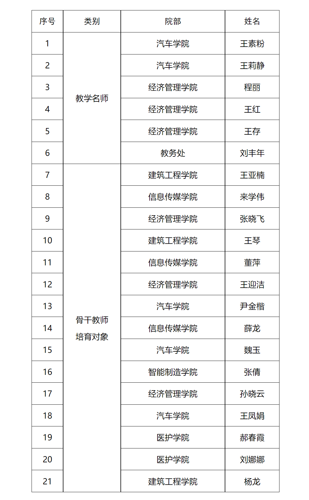 近日,河南省教育厅发布了《河南省教育厅 河南省人力资源和社会保障厅关于公布2022年河南省职业院校省级名师和省级骨干教师培育对象名单的通知》,我院6名教师获批省级名师,15名教师获批省级骨干教师培育对象。