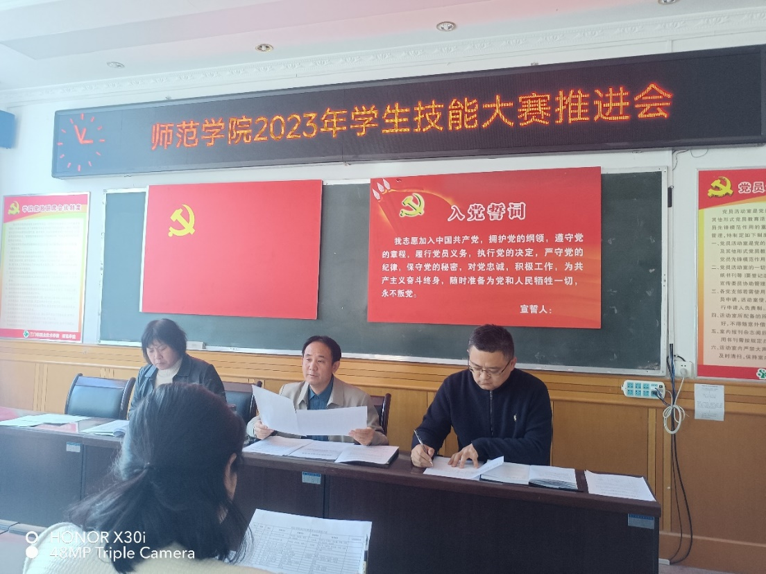 2023年11月6日下午3点,师范学院在5204会议室召开学生技能大赛工作推进会。师范学院院长任安忠、体育学院教学工作负责人任云兰出席会议,院部教学工作负责人王振龙主持会议,各教研室主任、指导教师参加了会议。