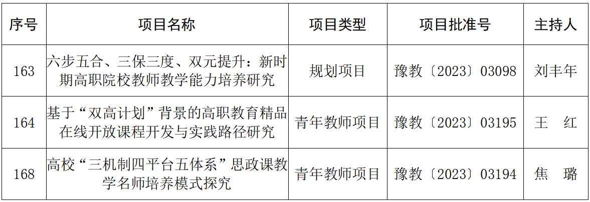 近日,河南省教育厅公布了《关于2024年河南省职业教育教学改革研究与实践项目和终身教育课题拟结项项目的公示》,我院申报的3个项目全部圆满结项。