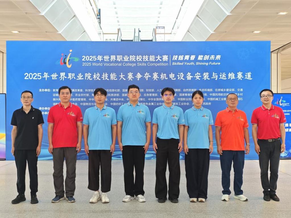 9月18日-22日,2025年世界职业院校技能大赛总决赛争夺赛“机电设备安装与运维”赛道在天津机电职业技术学院落下帷幕。由智能制造学院尤向阳和汽车学院雷楠楠主要指导,2023 级电气自动化技术专业李帅兵、于江坡、杜昊坤和2024级风力发电工程技术专业孙一四位同学组建的“智能光伏并网控制系统安装与运维”参赛团队与来自全国83所高职院校的90支代表队同台竞技,表现卓越,喜获铜奖,实现学院在世界职业院校技能大赛工科赛项的历史性突破。