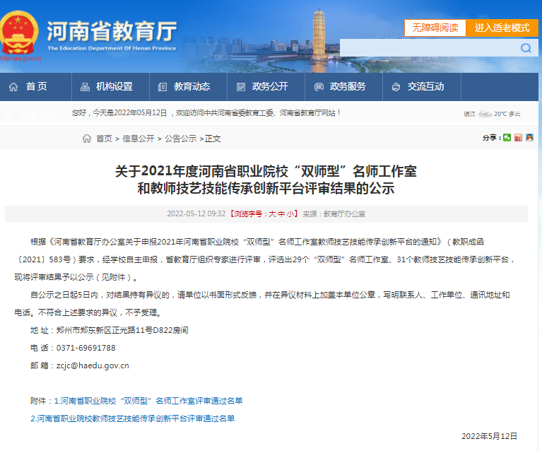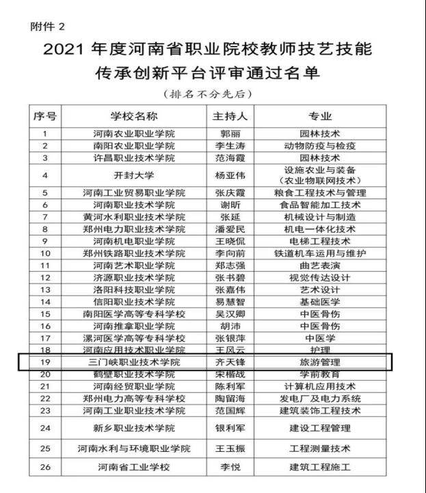 5月12日,河南省教育厅发布《关于2021年度河南省职业院校“双师型”名师工作室和教师技艺技能传承创新平台评审结果的公示》,我校教师旅游技艺技能传承创新平台拟获批立项建设,全省一共有31个教师技艺技能传承创新平台列入公示建设名单。