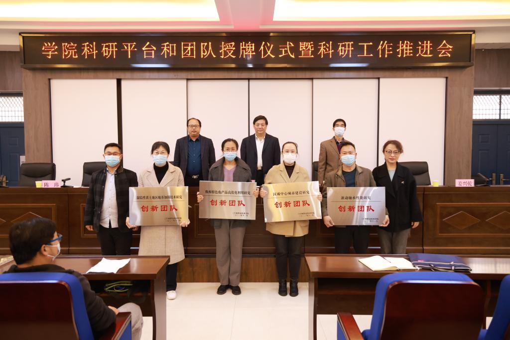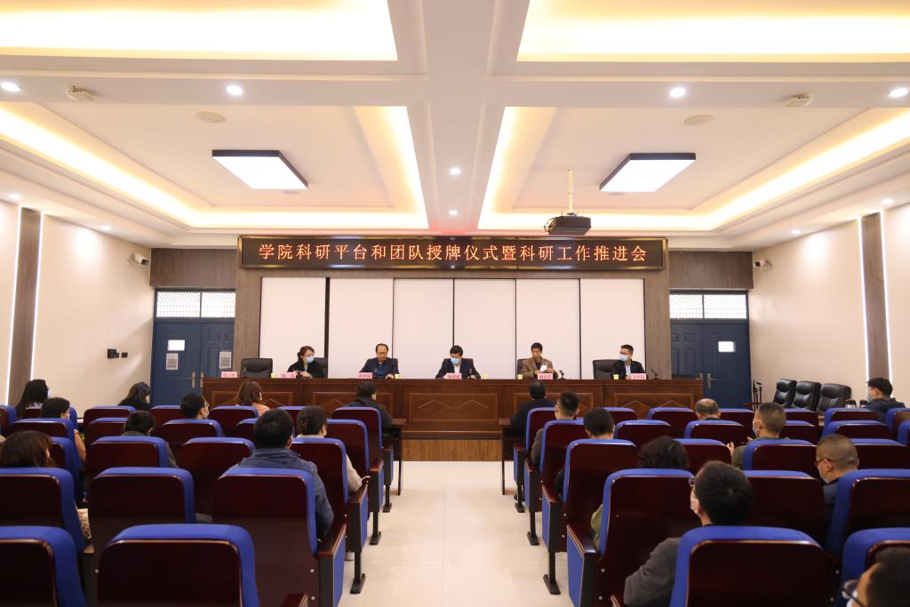3月31日下午,学院科研平台、团队授牌仪式暨科研工作推进会在1106会议室召开。党委副书记、院长颉潭成教授出席仪式并讲话。三门峡市科技局四级调研员杨占江、市科技局实验室与平台基地建设科负责人姜兴乾出席会议。各院部科研工作负责人、学院科研创新平台及创新团队负责人及科研处全体人员参加会议。会议由党委委员、副院长黄世谋教授主持。