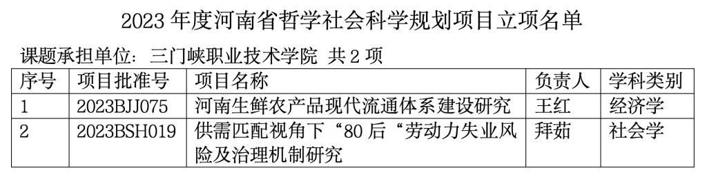 此次立项的两项项目分别为王红副教授主持的《河南生鲜农产品现代流通体系建设研究》,拜茹博士主持的《供需匹配下“80后”劳动力失业风险及治理机制研究》。项目分别围绕经济学领域和社会学领域展开,推动相关领域的理论创新和实践应用。两项课题立足于新时代河南省的发展需求,旨在为我省的社会经济发展提供有力的理论支撑。