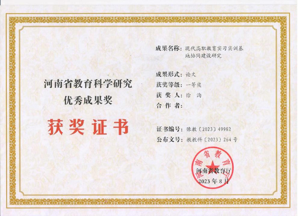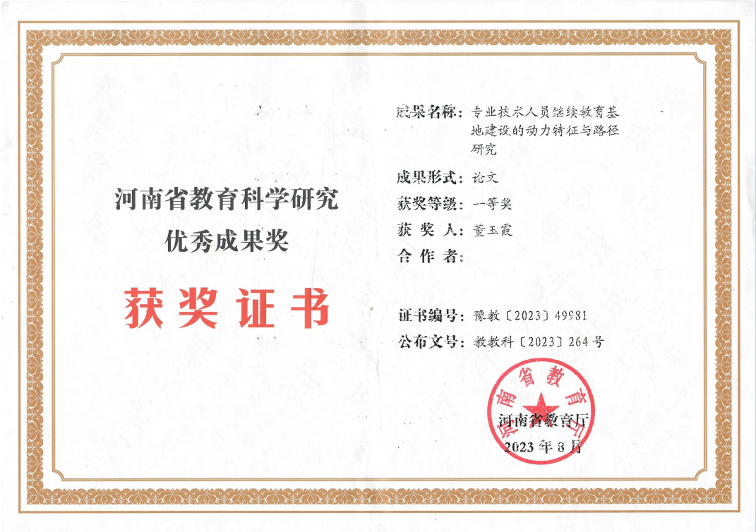河南省教育科学研究优秀成果奖由河南省教科规划办统一组织实施,参评范围包括上一年度河南省教育工作者出版的教育著作、发表的论文,获得全国、省教科规划办结项证书的课题成果。我校教师董玉霞的论文《专业技术人员继续教育基地建设的动力特征与路径研究》、徐洵的论文《现代高职教育实习实训基地协同建设研究》荣获一等奖,迟明梅的研究报告《基于CDIO理念的SPOC混合实践教学模式研究》荣获二等奖。