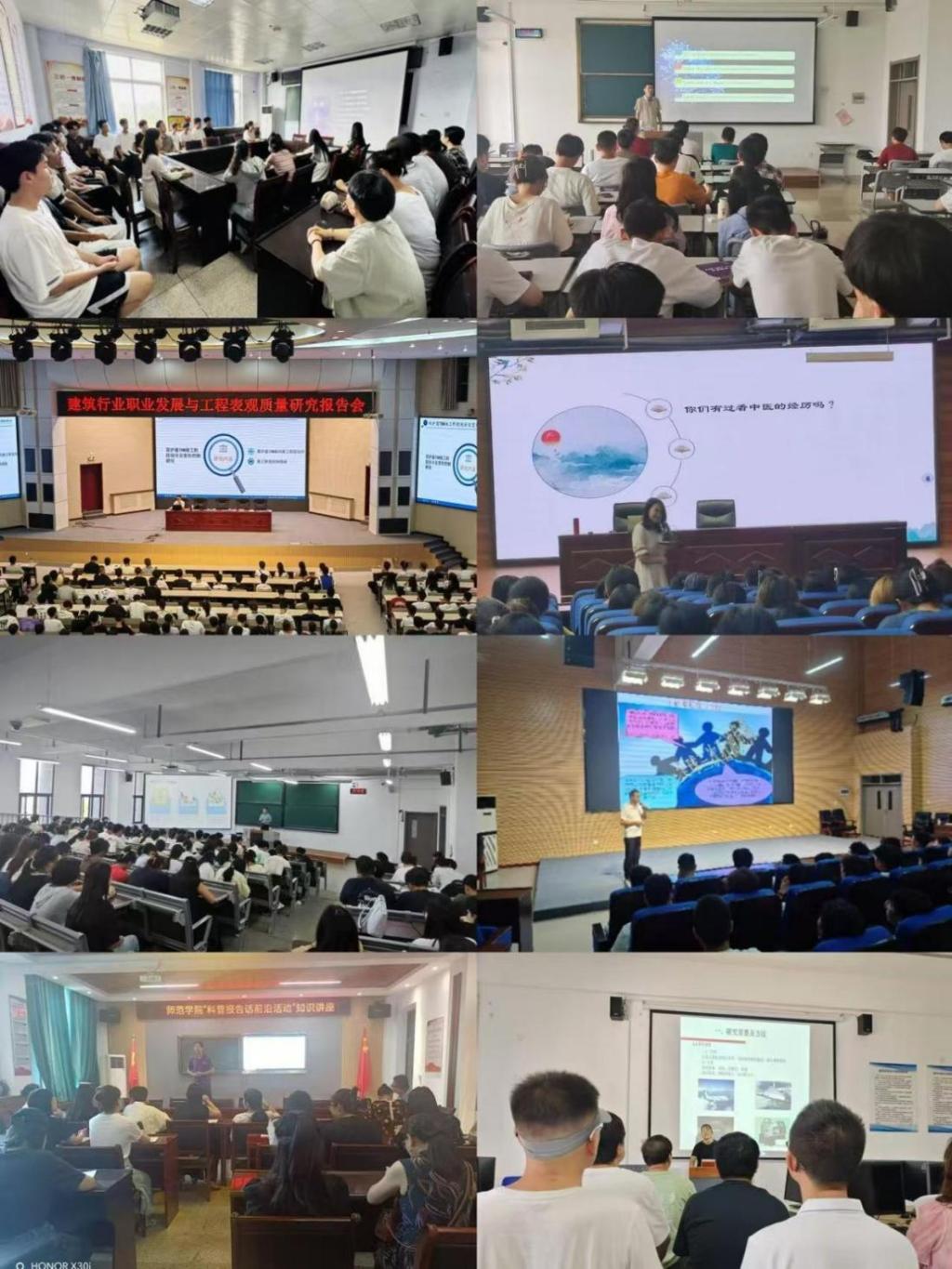 经济管理学院秦冲老师从新质生产力的定义、来源、作用、挑战,以及其驱动商贸流通业高质量发展的现实问题和路径选择六个方面,阐释了新质生产力与传统生产力的区别、重要意义及发展途径;应用工程学院胡宏伟博士深入核聚变能源这一前沿领域,讲解核聚变作为未来清洁能源的重要方向,承载着人类解决能源危机的希望,激发了学生们的科学探索热情;基础部邀请任宝珍老师科普了空间环境地面模拟装置、星际闪烁检测望远镜等九大国之重器,同时围绕高性能计算等前沿科技话题进行深入讲解,现场气氛热烈;建筑工程学院邀请中铁七局集团指挥部副总工程师檀俊坤博士,以土木行业大型工程施工与技术应用实例,从科研选题出发点、研究内容确立和方法应用、研究成果应用转化三方面讲解,理论与案例结合,引发师生对科研选题和成果应用的思考。