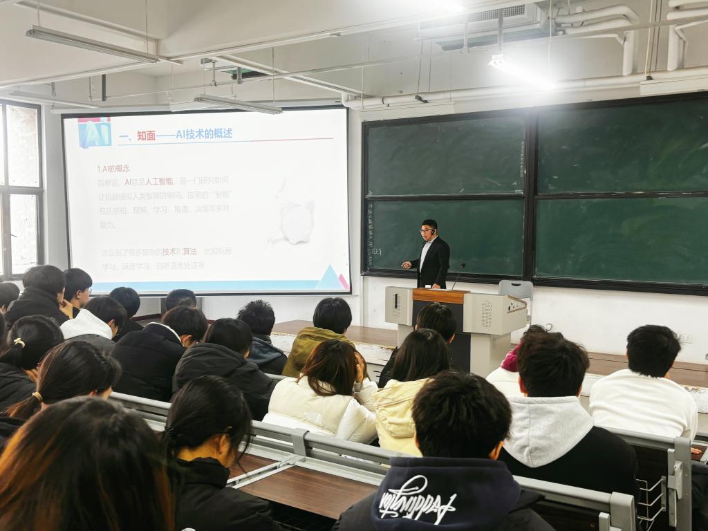 12月11日下午,信息传媒学院邀请河南科技大学应用工程学院欧群雍教授作了《AI技术揭秘及其应用》精彩讲座。欧群雍运用生动的语言,从人工智能技术原理、数据预处理和模型训练的关键技巧、AI的实现途径及应用范围等四个方面进行了深入阐述,并结合实际应用场景,通过图像识别、语音助手、智能客服等实例,直观地展示了人工智能在多个领域的卓越能力和应用技巧,使在场的师生深切感受到了AI技术强大魅力。