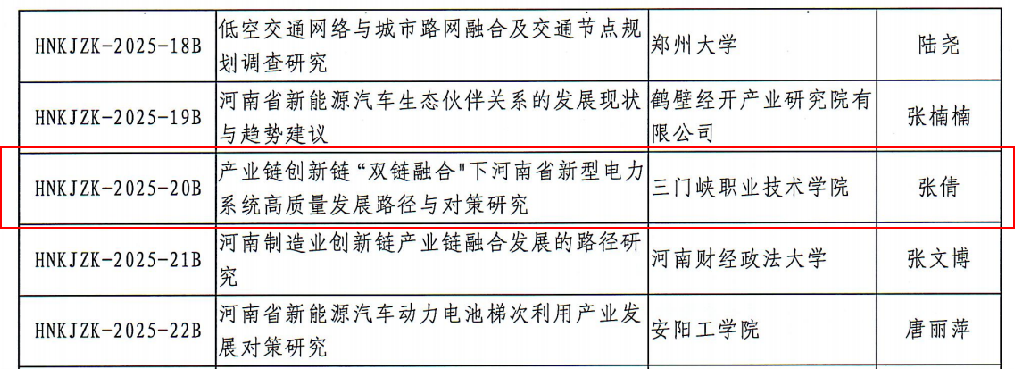 近日,河南省科学技术协会正式公布2025年度河南科技智库调研课题立项名单。学院智能制造学院张倩副教授申报的《产业链创新链“双链融合”下河南省新型电力系统高质量发展路径与对策研究》成功获批一般课题立项,项目批准编号:HNKJZK-2025-20B。